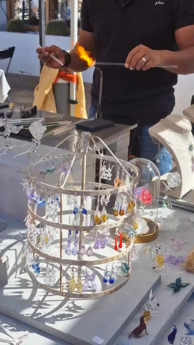 I love watching products being made before my eyes; it demonstrates that the items are handcrafted and not mass-produced. One of my favourite stalls at the market had an abundance of glass figurines and earrings, some of which were crafted right before our eyes.